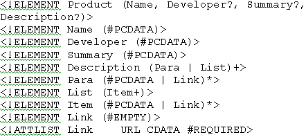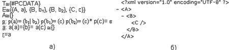 {ε },- элементы, содержащие данные : p(e) reg(T)/{ε },- элементы элементного содержания: p(e) reg(id(E))/ {ε },- элементы смешанного содержания : p(e) reg({id(E),T})/{ reg(E) reg(T)}В нашем примере, link -это элемент пустого содержания, name, developer, summary - элементы содержащие данные, product , description и list - элементного содержания, и наконец para и item - смешанного. Стоит заметить, что структурные схемам вида (T,E,A,p,a,r) однозначно соответствуют регулярные грамматики деревьев [13], если положить следующее: