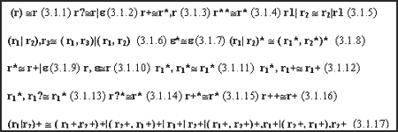 Остальные свойства интерпретации проверяются аналогично. В случае, когда E≡ E' шестое условие принимает следующий вид p Следствие 1 (Критерий эквивалентности схем, отличающихся только структурами) Пусть S=(T,E,A,p,a,r) и S'=( T,E,A,p',a,r) две структурные схемы, у которых множество валидируемых XML документов непустое, и отличающиеся только регулярными выражениями, задающими структурное вложение. Тогда схемы S и S' эквивалентны тогда и только тогда, когда Достаточное условие является следствием теоремы 3, а необходимое условие проверяется на множестве экземпляров XML документов, удовлетворяющих схемам. 3.1 Эквивалентные преобразованияУтверждение 7 (Эквивалентные регулярные выражения) Следующие регулярные выражения являются эквивалентными: