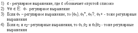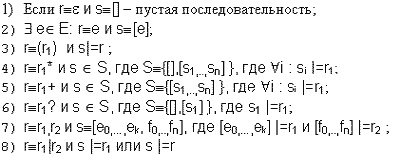 Определение 2 (Порождаемые последовательности) Пусть r- регулярное выражение над множеством E. Тогда конечная (м.б. пустая) последовательность s=[e0,..,en] символов, где
