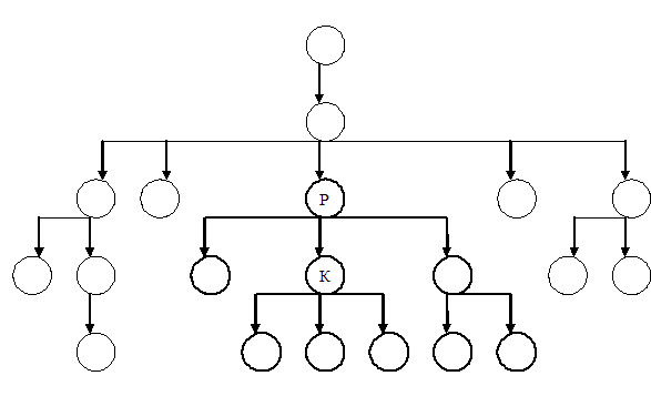 Рис. 3: Пример дерева XML-документа, над которым производится вычисление некоторого выражения XPath. Буквой К обозначен контекстный узел, буквой Р – родительский узел для контекстного узла.