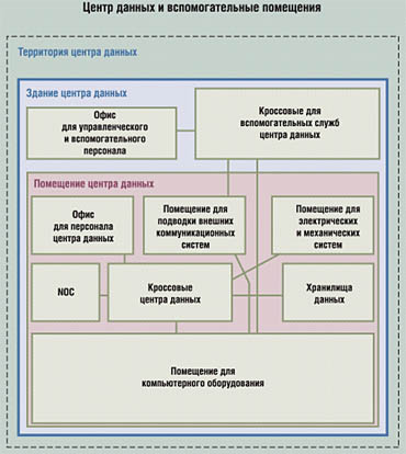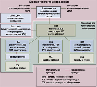 Для разработки подобного подхода, а также для формулирования и закрепления его в соответствующих документах была создана рабочая группа TR 42.1.1. Она предложила проект стандарта TIA/EIA 942, полное название которого звучит как "Телекоммуникационная инфраструктура для центров данных". Его окончательный вариант TIA намерена представить в начале 2005 года. Отправным моментом в разработке данного документа является необходимость обеспечения высокого уровня эксплуатационной готовности и наличия множественных запросов, поступающих от большого числа пользователей. Поэтому существенной является взаимосвязанность требований стандарта и спецификаций уровней центров данных согласно классификации Uptime Institute. Стандарт содержит ряд требований к строительным конструкциям, размерам помещений, размещению оборудования, электропитанию, кондиционированию и вентиляции и др. В соответствии со стандартом TIA/EIA 942 центр данных определяется как отдельное здание или часть здания, в котором будет размещаться компьютерное оборудование коллективного пользования, а также инфраструктурные решения, обслуживающие данное оборудование. Компьютерное оборудование сосредотачивается в особом помещении, специально предусмотренном для этого. Стандарт TIA/EIA 942 определяет общие требования к размерам и размещению центра данных;архитектурным особенностям и функциональному назначению помещений в соответствии со структурой служб центра данных, включая особенности отделки полов и стен; электроснабжению, заземлению и механическим системам; кабельной инфраструктуре и ее администрированию;охранным системам и системам пожарной безопасности, а также решениям доступа к телекоммуникационным сетям общего пользования. В ряде требований, предъявляемых к помещениям для компьютерного оборудования, а также к помещениям для подводки внешних телекоммуникационных систем, помимо таких характеристик, как высота потолков (не менее 2,5 м) , удельная нагрузка на пол (минимум 600 кг на 1 м2 , рекомендуется 1000 кг на 1 м2 ) , климатические условия (температура от +20 °С до +25 °С) и относительная влажность воздуха (от 40% до 55%) , содержатся особые требования, например, по размещению светильников и головок спринклерной системы пожаротушения не непосредственно над стойками, а над свободным пространством между ними. Помещение центра данныхСтандарт TIA/EIA 942 предусматривает обязательное выделение помещений для подводки внешних телекоммуникационных систем (Entrance Room) , компьютерного оборудования (Computer Room) и телекоммуникационного оборудования (Telecommunications Room). В помещении для компьютерного оборудования выделяются области основной разводки (Main Distribution Area, MDA), горизонтальной разводки (Horizontal Distribution Area, HDA), зоновой разводки (Zone Distribution Area, ZDA) и область разводки по оборудованию (Equipment Distribution Area, EDA).