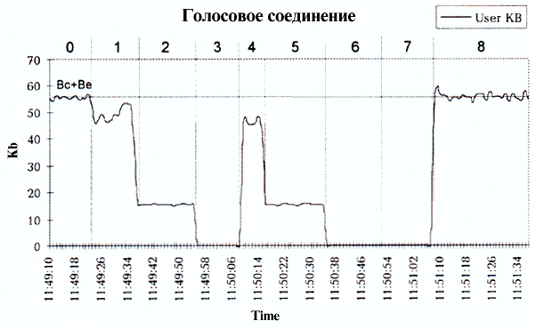 Рис. 1 Обнаружено следующее поведение трафика по DLCI 200 (См. Рис.2). При начале заполнения голосовой PVC, скорость передачи данных снижается (участок 1), через некоторое время падает до CIR (участок 2), а затем до 0 (участок 3), после чего цикл повторяется. В случае загрузки DLCI 200 большими пакетами, после падения скорости передачи до 0, передача данных не возобновляется даже после разрыва голосового соединения. Восстановление передачи происходит только после завершения протокола FR и его вторичного перезапуска.