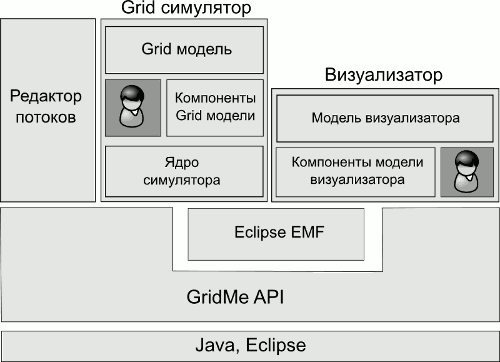 Система моделирования реализована на основе платформы Eclipse [2], с использованием только языка Java. Это дает возможность интеграции с другими Eclipse приложениями, например, средой разработки Java, системами контроля версий, и т.п. и позволяет использовать систему моделирования под различными операционными системами – Linux, Windows, Solaris и др. Система расширяема и рассчитана на гибкое использование. Система позволяет моделировать различные Grid архитектуры: одно и двух-уровневые системы с одним или несколькими брокерами, добавлять хранилища данных, определять топологию сетевых соединений и т.д. Система включает в себя множество реализованных компонент, таких как брокер, кластер, поток задач и т.д. Кроме того, пользователи могут расширять систему, реализовывая свои собственные компоненты. Поведение отдельных элементов моделируется с помощью конечных автоматов, что позволяет работать с моделями больших систем – порядка тысяч процессоров и более миллиона задач. Система предоставляет возможность для быстрого описания алгоритмов распределения задач с помощью набора правил. При моделировании распределения задач в Grid очень часто требуется проверить несколько алгоритмов, незначительно отличающихся друг от друга, например, сортировкой входного потока задач, способом выбора очередной задачи или ресурса и т.п. Описание алгоритма с помощью набора правил в такой ситуации позволяет гораздо быстрее проверить работу алгоритма, чем в случае реализации его в виде, например, Java класса, с последующей отладкой и тестированием. В системе поддерживается возможность проведения серии экспериментов, состоящей из последовательных запусков выполняемой модели с изменением некоторых параметров при каждом следующем запуске. Например, может изменяться поток задач, конфигурация кластеров, сетевых соединений и т.п. Это позволяет в рамках одного эксперимента посмотреть динамику изменения эффективности системы и определить узкие места. В системе реализован удобный механизм обработки результатов моделирования. Результат выполнения модели хранится в отдельном профиле и может обрабатываться независимо. Пользователь может использовать свой шаблон для выбора и визуализации только необходимой в данный момент информации. Это позволяет нескольким исследователям провести моделирование один раз, а затем независимо анализировать полученную информацию. Система также включает в себя редактор и анализатор записей потоков задач (workload) [15, 8]. Запись потока представляет собой текстовый файл, каждая строка которого содержит характеристики отдельной задачи: время порождения, время запуска, общее время выполнения, количество занимаемых процессоров и т.д. Анализатор позволяет отобразить различные характеристики потока – количество задач, соотношение однопроцессорных и параллельных задач, график порождения задач во времени и т.п. С помощью редактора можно изменять поток – копировать и перемещать части потока, соединять несколько потоков в один, изменять характеристики группы задач и т.п. Также, редактор позволяет создавать синтетический поток по заданным параметрам. Основные компоненты системы изображены на рисунке 1(b). Это – редактор и анализатор потоков, симулятор Grid системы, визуализатор. 2.1. Модель представления Grid системыМодель для представления Grid инфр