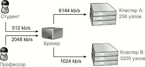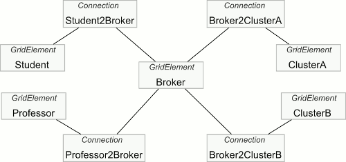 Пользователи, брокер и кластеры представляются с помощью Grid-элементов, с именами Student, Professor, Broker, ClusterA, ClusterB соответственно – рисунок 4(b). Для задания соединений используются элементы