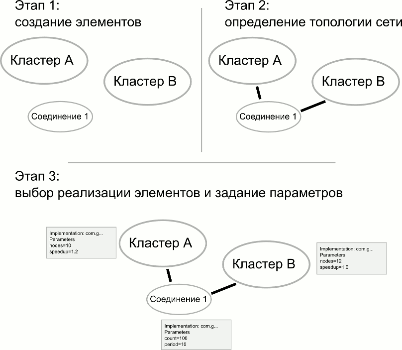 Модель Grid состоит из множества элементов ( Таким образом, модель Grid-системы определяется в несколько этапов (рисунок 3). Сначала мы создаем Grid элементы, из которых будет состоять Grid система. Затем задаем топологию сети путем создания связей между элементами и сетевыми соединениями. И на последнем этапе выбираем реализацию каждого элемента и определяем значения параметров для конкретной реализации. Рисунок 3: Этапы определения модели Grid-системы В системе представлены основные элементы, необходимые для создания моделей Grid. Это – кластер, брокер, поток задач, сетевое соединение. Базовый набор реализованных алгоритмов распределения для кластера и брокера включают: