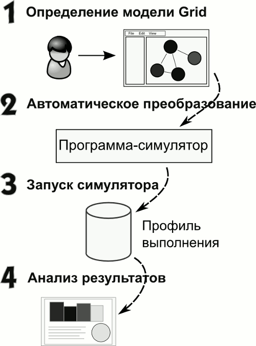 В настоящее время существует несколько проектов по разработке систем моделирования Grid. Среди них наиболее известны: Bricks [14], MicroGrid [11], OptorSim [13], SimGrid [10] и GridSim [1]. Данные системы обладают как достоинствами, так и недостатками. Среди недостатков можно отметить узкую специализацию систем, отсутствие публично доступных версий, а также ограниченность моделируемых архитектур Grid систем. Особенности реализации некоторых из них накладывают ограничения на количество одновременно существующих элементов в Grid системе и требуют от пользователя знания специальных языков программирования, что значительно снижает эффективность работы с такими системами. 2. Система моделирования GridС 2007 года в ИСП РАН разрабатывается система моделирования Grid. При разработке мы старались избежать недостатков, присущих существующим системам, а также реализовать некоторые новые интересные идеи. В частности, система проектировалась так, чтобы сделать работу пользователя максимально удобной и быстрой. В отличие от перечисленных выше систем в разработанной системе не нужно вручную писать программу моделирования. Пользователь работает в специальном редакторе, задавая топологию Grid системы и свойства отдельных элементов. При этом автоматически проверяются различные виды ошибок: значения параметров, выходящие за область допустимых значений, несовместимость различных элементов, соединенных между собой, и т.п. Сценарий работы с системой изображен на рисунке 1(a). Пользователь задает описание моделируемой среды и указывает различные параметры. Система автоматически генерирует код программы моделирования и компилирует его. Программа-симулятор запускается и создает в результате своей работы профиль выполнения. Полученный профиль анализируется и представляется пользователю в виде HTML документа.