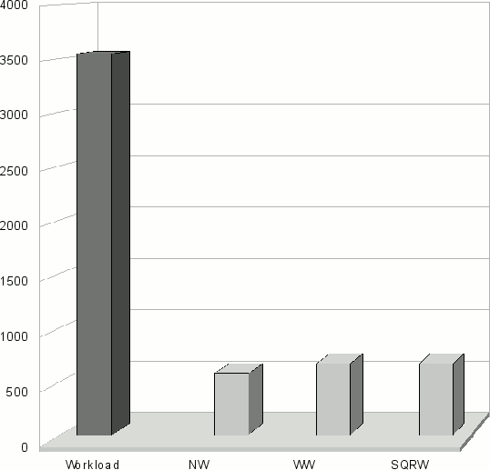 где N – общее число запущенных задач, Tstart – время запуска задачи, Tsubmit – время постановки задачи в очередь кластера. На рисунке 9(b) показана средняя длина очереди. Первый столбец на обеих диаграммах соответствует распределению задач без брокера. На рисунках 9(c) и 9(d) показаны средняя длина очереди и среднее время ожидания на каждом кластере в секундах. Результаты показывают, что для данной вычислительной системы распределение потока однопроцессорных заданий через брокер дает значительный эффект: снижается среднее время ожидания заданий в очереди, а также происходит более равномерная загрузка вычислительных ресурсов. При распределении всех задач (не только однопроцессорных) через брокер среднее время ожидания становится примерно на 5-7% меньше, чем в приведенных результатах. Однако, мы приводим результаты для распределения только однопроцессорных задач, поскольку для проведения данных экспериментов нам была доступна информация только в виде записи потока задач. Из записи потока невозможно определить, почему задача отправляется пользователем на тот или иной вычислительный ресурс. Причиной может быть архитектура системы, наличие специального программного обеспечения, личные пристрастия и т.п. Мы сделали предположение, что однопроцессорные задачи менее привязаны к конкретному кластеру, так как не зависят от среды передачи данных, которая установлена на кластере. Для системы Sharcnet такое предположение наиболее логично, так как среда передачи данных не одинакова для всех кластеров – таблица 3.