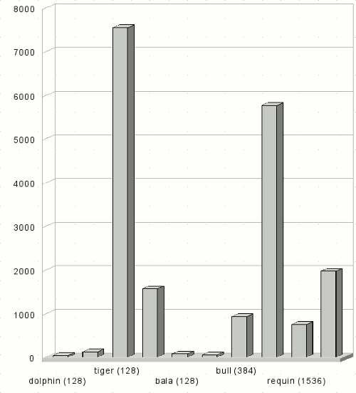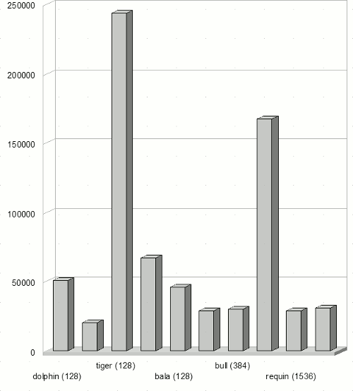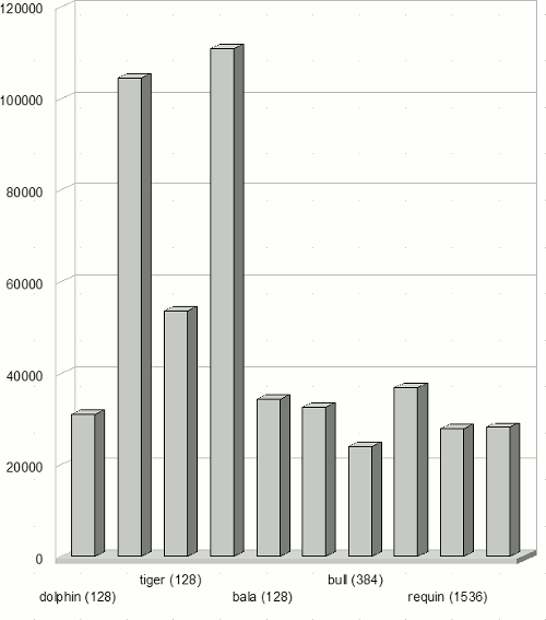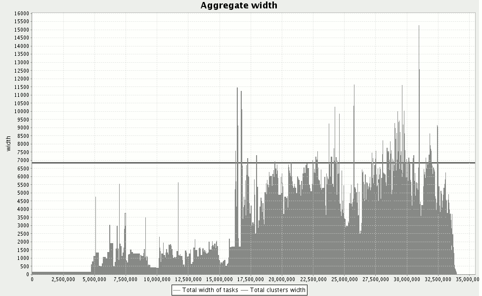Данный поток состоит по большей части из однопроцессорных задач. Однако, параллельных задач достаточно много – примерно 10%. Длина задач распределена более равномерно – большая часть, примерно 30%, имеет длину от 1 до 10 часов и чуть более половины всех задач по длительности составляют меньше одного часа, включая все большие параллельные задачи. На рисунке 7 представлен график суммарного числа запрашиваемых процессоров в единицу времени. По оси абсцисс отложено время в секундах, по оси ординат – суммарное число запрашиваемых процессоров. Синяя горизонтальная линия показывает общее число процессоров в системе. Рисунок 7: Суммарное число запрашиваемых процессоров в единицу времени Мы видим, что поток не равномерный, на протяжении всего интервала присутствуют всплески запрашиваемого количества процессоров. Также, на графике можно заметить периодичность изменения нагрузки – временные интервалы 5000000, 1000000, 15000000 и т.д. Данные особенности присущи практически всем реальным потокам [3]. Примерно в середине временного интервала происходит перегрузка системы – запрашиваемая ширина становится больше доступной. Это говорит о том, что при любом распределении задач, в системе будут присутствовать очереди. Для данного потока, с 10% параллельных задач, будет происходить неполное заполнение кластеров, что еще больше увеличит размер очередей. Особенность данного потока состоит также в том, что пользователи направляли задачи на кластеры непосредственно – для распределения не использовался брокер. При анализе потока оказалось, что в системе присутствует существенный дисбаланс нагрузки (рисунок 8).