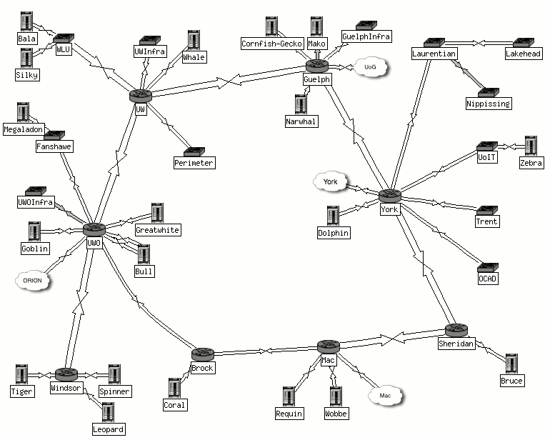 3. ЭкспериментыЦель экспериментов заключалась в следующем. С использованием реализованного прототипа среды смоделировать поведение реально существующей Grid системы при различных условиях. В качестве распределенной Grid системы была выбрана сеть Sharcnet [18]. Распределенная вычислительная система Sharcnet (Shared Hierarchical Academic Research Computing Network) – это консорциум из 16 колледжей и университетов в юго-западной части провинции Канады Онтарио, вычислительные ресурсы которых объединены высокоскоростной оптической сетью (рисунок 5). Рисунок 5: Схема распределенной вычислительной системы Sharcnet Характеристики вычислительных ресурсов сети Sharcnet представлены в таблице 2.