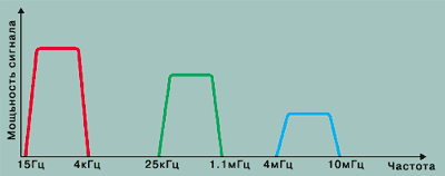 Рисунок 1. Сигналы HomePNA не мешают ни чему. Как именно? Разумеется, при создании технологии, которая позволила бы организовать сеть высокоскоростной передачи данных на базе обыкновенной телефонной линии, не обошлось без определенных трудностей. Например, при использовании технологии Ethernet со скоростью передачи данных 10 Мбит/с в корпоративных сетях для передачи данных необходимо использовать кабели типа "витая пара". В квартирах же уже имеется готовая телефонная проводка, но по своему первоначальному назначению она не должна использоваться для передачи данных. Создание недорогой технологии высокоскоростной передачи данных по абонентской телефонной линии, имеющей разнообразную и случайную топологию, является достаточно сложной инженерной задачей, которую удалось решить только на базе современной интегральной техники, используемой для высокоскоростной обработки сигнала. Среди основных особенностей технологии организации домашних сетей, альянс HomePNA отметил следующие.