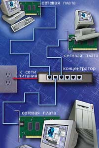 Сетевой концентратор выступает в роли регулировщика движения данных в сети, поэтому необходимо поместить его в центре (между всеми ПК) и рядом с источником питания. Убедитесь, что кабели, которыми вы будете подключать компьютеры к портам концентратора, имеют достаточную длину: не будут путаться под ногами и их не придется сдвигать. Установите сетевые платы.Выключите все ПК и выньте вилки из сетевых розеток. Чтобы защитить сетевые платы от электрического заряда, способного вывести их из строя, наденьте антистатический браслет. Найдите в каждом из ПК свободный разъем (в зависимости от типа сетевой платы может потребоваться ISA- или PCI-разъем), удалите расположенную напротив него на задней стенке корпуса металлическую пластину, вставьте плату, убедитесь, что она плотно установлена в разъеме, и закрепите ее винтами.