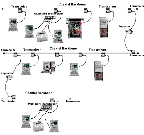Рис. 2. Многосегментный Ethernet, построенный с применением технологии 10Base-5 Правила проектирования сетей стандарта 10Base-2Множество сетей стандарта 10Base-2 было построено во второй половине 80-х - начале 90-х г.г. В настоящее время, как правило, областью применения этого стандарта являются магистральные каналы, при помощи которых объединяются рабочие группы, построенные с применением технологии 10Base-T, а также небольшие ЛВС, как правило одноранговые и имеющие в своем составе не более 10-ти (обычно 3-5) компьютеров. Широкое применение технологии 10Base-2 сдерживается недостаточно высокой надежностью кабельной подсистемы в целом как системы с "общей шиной", а также тем, что на практике она была дискредитирована в результате повсеместного применения при монтаже не специфицированных для этого кабелей, что приводило к неустойчивой работе сетей, построенных с применением этого вида технологии. Лично мне приходилось наблюдать результаты применения не просто неподходящего кабеля по своим геометрическим характеристикам, но даже применение сегментов с волновым сопротивлением 75 и 100 ом. Правила применения технологии 10Base-2: