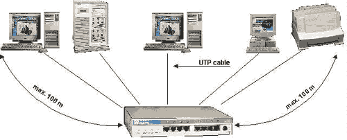 Рис. 4. Вариант расширенного применения Ethernet-а стандарта 10Base-2 Правила проектирования сетей стандарта 10Base-TТехнология 10Base-T была стандартизована только в 1990 году (стандарт IEEE 802.3). 10Base-T предусматривает построение ЛВС путем использования кабельных сегментов для создания точечных каналов связи (point-to-point links). Тем самым основной топологией становится уже не "шина", как в 10Base-5 и 10Base-2, а "звезда". Геометрические размеры сетей, построенных по варианту 10Base-T так же зависят от затухания сигнала в передающей среде и от времени распространения сигнала. Дело в том, что определив другой тип кабеля, соединители и другую топологию сети, 10Base-T остается тем же самым Ethernet-ом (в логическом смысле) и 10Base-5. В логическом смысле, концентратор - Hub это просто сегмент коаксиального кабеля из технологии 10Base-5 или 10Base-2. Правила применения технологии 10Base-T: