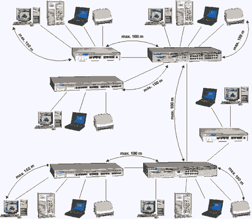Рис. 6. Вариант предельной топологии с применением технологии 10Base-T Резюме правил и рекомендаций стандарта IEEE 802.3