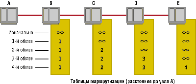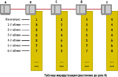 Рисунок 1. Распространение "хорошей" новости в сети. Пусть в начальный момент времени маршрутизатор A не был доступен, т. е. расстояние до него во всех таблицах - бесконечность. При включении А пошлет сообщение своему соседу - узлу B. Все остальные маршрутизаторы узнают об этом через последовательный обмен сообщениями (для простоты будем считать, что обмен между всеми соседними узлами происходит синхронно каждые несколько секунд). Во время первого обмена узел B узнает, что A заработал и вносит в свою таблицу маршрутизации "1" как расстояние до A; все остальные узлы в этот момент по-прежнему считают A недоступным. При следующем обмене, спустя несколько секунд, узел C также узнает о появлении маршрутизатора A. В результате последовательности таких обменов информация достигнет и узла E, для которого стоимость маршрута до А будет "4". Таким образом, для сети с максимальной длиной маршрута N сообщение о новом маршрутизаторе дойдет до самого удаленного узла в сети через N-1 циклов обмена таблицами маршрутизации. На этом этапе никаких проблем не возникает. Теперь мы рассмотрим обратный случай (см. Рисунок 2), когда узел А перестает работать вследствие сбоя. При очередном обмене (мы будем считать его первым в этой серии) узел В не получает никакого сообщения от молчащего маршрутизатора А. Это верный сигнал о том, что у А возникли проблемы, и информацию о нем необходимо удалить из таблицы. Однако в то же самое время узел C сообщает, что ему известен путь до А и стоимость этого пути "2". Тот факт, что путь до А, объявленный узлом C, проходит через сам B (т. е. образуется петля), ускользает от внимания маршрутизатора, и он заносит в таблицу путь до неработающего А стоимостью "3".