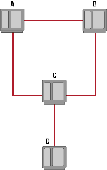 Рисунок 3. Пример ситуации, когда правило расщепления горизонта не действует. Рассмотрим пример сети с избыточной топологией (см. Рисунок 3). В начальный момент времени А и B знают, что расстояние до узла D равно "2". После выхода D из строя маршрутизатор C, не получив от D сообщения, определяет, что узел D недоступен. А и В продолжают считать D доступным, но правило расщепления горизонта запрещает им сообщать эту ложную информацию маршрутизатору С. При следующем обмене C уведомляет A и B о недоступности D. Но одновременно с этим узел А получает от В сообщение о пути до D стоимостью "2", а узел В получает аналогичное сообщение от А. Информация об аварии на D не будет услышана. Проблема возрастания до бесконечности возникла вновь. ДОВЕРЯЙ, НО ПРОВЕРЯЙВ рассмотренном выше примере маршрутизаторы A и B не смогли корректно определить отказ узла D. Не помогло и правило расщепления горизонта. Подобную проблему помогает решить метод временного отказа от приема сообщений (hold-down), используемый современными протоколами вектора расстояний. Правило отказа от приема запрещает маршрутизатору, получившему сообщение об отказе узла, принимать объявления маршрута до этого узла в течение некоторого времени. Получив от C уведомление о недоступности D, маршрутизатор А не должен доверять сообщению узла B, так как в момент обмена тот не имел достоверной информации о D. Лишь спустя некоторое время, когда можно быть уверенным, что информация об отказе D распространилась по всей сети, маршрутизатор A может вновь начинать принимать объявления о путях до D. (За это время и А и B сотрут информацию о маршруте до D, так как оно превышает время хранения записи в таблице маршрутизации.) ЦЕПНАЯ РЕАКЦИЯС момента появления алгоритма вектора расстояний научные журналы периодически публикуют описания разных, часто очень сложных, алгоритмов для решения проблемы возрастания до бесконечности. К сожалению, ни один такой метод не позволяет полностью справиться с названной задачей. Зловещий призрак count-to-infinity продолжает бродить по сетям, использующим в своей работе протоколы вектора расстояний. Если зацикливание в сети все же произошло, то образовавшаяся петля будет разорвана, когда метрика маршрута превысит максимально допустимую. Этот процесс может быть ускорен с помощью механизма принудительных объявлений (triggered updates). Правило принудительных объявлений звучит следующим образом: "Узнав об изменении метрики маршрута, маршрутизатор обязан немедленно сообщить об этом соседям". Узнав об отказе маршрутизатора А (см. Рисунок 2), узел B не будет ждать следующего обмена, а тут же сообщит об отказе узлу C. Узел C, в свою очередь, немедленно проинформирует D. Выход из строя узла A вызывает быстро распространяющуюся по сети волну объявлений. В результате адаптация сети к изменившейся топологии произойдет значительно быстрее. Однако при выходе из строя одного из каналов сети не все объявления дойдут до получателей. В этом случае маршрутизатор, так и не узнавший о произошедших изменениях, будет продолжать рекламировать устаревшие маршруты, а при отсутствии механизма отказа от приема проблема возрастания до бесконечности вновь спутает таблицы маршрутизации. МАЛЕНЬКИЕ ХИТРОСТИСовременные протоколы вектора расстояний IGRP и EIGRP поддерживаются, например, маршрутизаторами Cisco. Они имеют такую полезн