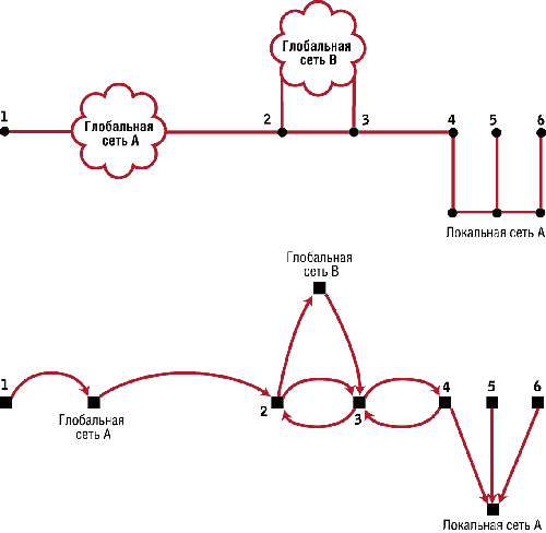 Рисунок 5. Сеть и ее предствление в виде графа. НЕНАВЯЗЧИВЫЙ СЕРВИСНаиболее популярные протоколы состояния канала - это IS-IS и OSPF. Протокол IS-IS изначально создавался для сетей OSI, но впоследствии был адаптирован и к другим протоколам сетевого уровня, в частности к IP. Например, сеть NSFNet широко использует IS-IS в своей работе. К основным достоинствам IS-IS принято относить его "врожденную" способность взаимодействовать с самыми различными протоколами сетевого уровня, что делает его особенно полезным в крупных многопротокольных сетях. В сетях TCP/IP, все же, более популярен протокол OSPF. Протоколы IS-IS и OSPF имеют очень много общего (OSPF, по сути, является улучшенной версией IS-IS). Все сказанное ранее о протоколах состояния канала в равной степе-ни справедливо и для IS-IS, и для OSPF. Протоколом OSPF предусмотрена полезная возможность вычисления отдельного набора маршрутов для каждого значения поля "тип сервиса" (Type-Of-Service, TOS) в заголовке протокола IP. До создания OSPF ни один протокол не использовал значение этого поля. Поле "тип сервиса" позволяет запрашивать для трафика определенный уровень сервиса. Длина поля - четыре бита, из которых значимым может быть только один. Таким образом, мы имеем всего четыре возможных варианта: минимальная задержка, максимальная пропускная способность, максимальная надежность, минимальная стоимость (в смысле оплаты). Каждое приложение по-разному устанавливает значение поля TOS. Значения битов данного поля для некоторых приложений приведены ниже (см. Таблица 1). Как видно из таблицы, протоколам FTP и SMTP требуется передавать команды с минимальной задержкой, а для передачи данных им необходима большая пропускная способность. Если запрос DNS передается по протоколу UDP, то очевидно, что программа-resolver, пославшая этот запрос, желает получить ответ как можно скорее, так как дейтаграммы UDP не требуют посылки подтверждений. Настроив протокол OSPF для определения маршрутов либо с минимальной задержкой, либо с максимальной пропускной способностью, в зависимости от TOS, мы можем еще больше ускорить работу DNS, так же как FTP и SMTP. Однако не стоит забывать, что протоколы состояния канала очень требовательны к памяти. Злоупотребление богатыми возможностями OSPF быстро приведет к переполнению памяти маршрутизатора и сбоям при вычислениях маршрутов. В итоге весь трафик окажется в состоянии хаоса, и никакого заявленного типа сервиса он не получит. ЧТО-ТО С ПАМЯТЬЮ МОЕЙ СТАЛО...Необходимо помнить, что абсолютно надежных протоколов маршрутизации не существует. При чрезмерной нагрузке отказать может любой протокол. Каких-то общепринятых стандартов настройки протоколов состояния канала нет. Однако обычно их настройка производится с учетом следующих соображений. Протоколам маршрутизации традиционно не нравятся "облака" сетей X.25 и frame relay. Большое число медленных каналов, соответственно, требующих рассылки большого числа объявлений LSA, затрудняет работу. Рассылка объявлений производится по "веерному" методу, поэтому полносвязная (fully-meshed) топология сети нежелательна. Сети с частично связной (partial-meshed) топологией здесь более предпочтительны. Несмотря на отсутствие строгого ограничения на максимальное количество узлов в сети, возможности протоколов все же не безграничны. Эксперименты с протоколом OSPF показали, что 50 маршрутизаторов на зону (area) - это верхн