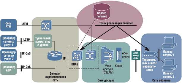 Все эти моменты отображены в ряде последних технических документов DSL Forum, в том числе TR0058, TR0059 и TR0094. Они формулируют требования и описывают структуру сети для организации DSL-доступа нового поколения. Данные документы определяют по меньшей мере три основных изменения. DSL-доступ для жилого сектора и для бизнес-сектора интегрируется с другими решениями в сети доступа и зоновой широкополосной сети. Основной транспортной технологией для мультиплексоров доступа DSLAM становится Ethernet. Также предлагается размещать узлы доступа на одной площадке с широкополосными серверами удаленного доступа (B-RAS). Совершенствование возможностей маршрутизаторов и оптических технологий позволяет предельно упростить ядро сети. В частности, предполагается отказ от применения там маршрутизаторов и реализации их функциональности в совмещенных пограничных маршрутизаторах, которые устанавливаются в узлах агрегирования трафика. В таком случае B-RAS оказывается частью квазиинтеллектуального распределенного пограничного маршрутизатора, для которого нужно установить особенности работы с виртуальными частными сетями MPLS/BGP VPNS, а также определить QoS. В исследовании Heavy Reading "Next-Generation DSL Equipment: The Path to Profitability" перечисляются устройства Cisco, Juniper, net.com, Nortel Networks и ряда других производителей, которые позволяют реализовывать B-RAS в соответствии с принципами, определенными в TR0059. Кроме того, в этом отчете отмечается тенденция разделения решений B-RAS на два класса: metro B-RAS, которые размещаются ближе к ядру сети и обслуживают большое число абонентов, и CO B-RAS, которые устанавливаются в помещениях АТС и выносах. Архитектура сети доступаСвое видение развития архитектуры сети доступа в целом DSL Forum представляет в документе TR59. Основной смысл изменений заключается в распространении поддержки качества обслуживания на основных участках сети и в реализации стандартизированных интерфейсов для соединения с сетями провайдеров сетевых услуг (NSP) и провайдеров приложений (ASP). Также в этом документе рассматриваются особенности размещения оборудования для каждого участка с учетом возможности предоставления новых типов услуг и наиболее эффективной транспортировки пакетов от B-RAS далее по сети. В частности, TR-59 описывает две фазы внедрения механизмов качества обслуживания. Сначала задается управляемая поддержка QOS в B-RAS и терминальном оборудовании (абонентских шлюзах/маршрутизаторах). Затем организуется динамическое определение политики доставки трафика в зависимости от особенностей конкретного сервиса. Новое поколение DSL-технологийКонечно, оптимизация архитектуры сетей доступа имеет первостепенное значение, но с точки зрения поставщиков услуг доступа и абонентов куда более существенными факторами являются предоставление большей пропускной способности или увеличение дальности связи. С учетом этого появились новые реализации xDSL, которые обобщенно рассматриваются как новое поколение DSL-технологий. Такие технологии значительно расширяют возможности по организации высокоскоростных сервисов с использованием уже существующей инфраструктуры и основываются на отработанных подходах, позволяя максимально использовать опыт, накопленный в ходе реализации эксплуатируемых решений DSL-доступа. Процесс усовершенствования передачи данных положил начало исследованиям в неско