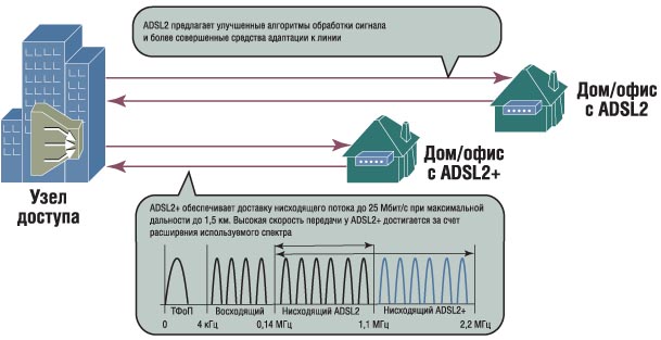 Технологии переднего планаНиколай Силаков, http://www.seti.com.ua DSL-доступ обладает возможностями по доставке абонентам разнообразных сервисов. Дальнейшие успехи в этом секторе могут быть достигнуты благодаря применению технических решений, позволяющих наиболее эффективно реализовывать данные возможности и распространить их на потоковые услуги. Широкополосная десятинаПризнание широкополосного доступа и заметный рост числа пользователей происходят практически повсеместно. По данным отчета World Broadband Statistics Q2 2004, опубликованного компанией Point Topic, за шесть месяцев текущего года число широкополосных подключений в мире увеличилось со 100 до 123 млн. (а рост по сравнению с результатами первого полугодия 2003 года составил без малого 100%). Причем на втором месте и по численности линий, и по показателям роста оказался Китай, что подтверждает мнение экспертов Alcatel, которые обращали внимание на потенциал широкого доступа в этой стране, а также в Бразилии, Индии, Саудовской Аравии и Украине. Таким образом, потребители уже оценили достоинства DSL-услуг и готовы выделять средства на их получение. Необходимо только, чтобы провайдеры услуг и поставщики оборудования могли усиливать эту готовность благодаря своим предложениям. Основное преимущество широкополосных технологий определяется двумя факторами: возможностью осуществления нескольких подключений через один интерфейс и поддержкой услуг, требующих соблюдения особенностей передачи данных, то есть услуг с разным уровнем качества обслуживания, QoS (прежде всего это относится к потоковым услугам). Перечень услуг и особенности QoS приводятся в таблице ниже. Группа лидирующих технологийТехнологии цифровых абонентских линий (Digital Subscriber Line – DSL) представляют наиболее интенсивно развивающийся сегмент решений широкополосного доступа. И это естественно, поскольку они фактически революционизируют существующую кабельную инфраструктуру, позволяя реализовывать на ней такие привлекательные услуги, как высокоскоростной интернет, видео по запросу, объединение сегментов локальных сетей. При этом некоторые DSL-технологии позволяют пользоваться услугами традиционной телефонии в рамках одного и того же подключения. По данным консорциума DSL Forum, которые совпадают с результатами уже упоминавшегося отчета Point Topic, на конец первого полугодия 2004 года в мире насчитывалось свыше 73 млн. xDSL-подключений (символом "x" обозначаются любые возможные реализации данного семейства технологий), а их численность за год возросла более чем на 30 млн. Причем если общее лидерство по численности широкополосных подключений принадлежит США (29,2 млн. подключений, из которых 11,4 млн. приходятся на xDSL), то на первом месте по внедрению DSL оказался Китай (12,7 млн. подключений). Именно Китай за двенадцать месяцев добился 119%-ного роста численности xDSL-подключений, что позволило ему обойти США, Южную Корею и Японию. На пути к современным услугамИтак, последние полтора года рынок DSL-доступа переживает радикальные изменения, которые обусловлены не только ростом численности подключений. Сегодня стоит задача модернизации оборудования для поставщиков услуг таким образом, чтобы оно было способно не только обслуживать большее количество сеансов связи при более высоких объемах трафика, но и обеспечивать современный уровень услуг (включая потоковы