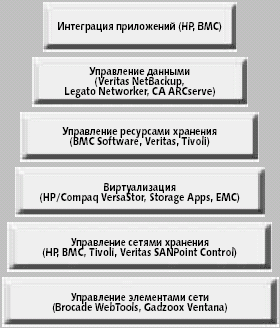 Управление устройствами обеспечивает автоматическое построение топологии сети, мониторинг событий и последующее определение работоспособности устройств сети хранения. Storage Builder ведет учет емкости, позволяя устанавливать необходимые пороговые значения, а также собирать статистику и составлять отчеты. На основе полученной информации продукт Storage Optimizer обеспечивает мониторинг производительности системы хранения и сбор статистики. Продукт Storage Accountant позволяет проводить учет использования среды хранения, а также расчет важных финансовых характеристик. Данные функции непосредственно связаны с качеством работы системы, поэтому Storage Accountant обеспечивает функцию управления качеством услуг (SLM — service level management). Storage Allocater, позволяет вести контроль доступа и логическое распределение дискового пространства без перезагрузки системы. OV Storage Provisioner, обеспечивает контроль над организацией хранения данных. Другими словами, процесс Storage Provisioning обеспечивает автоматизацию процессов внесения изменений, которые должны быть сделаны в среде с сохранением правил доступа между существующими системами и устройствами хранения данных, для достижения определенного качества предоставляемых услуг. BMC Software Application-Centric Storage ManagementПредставленная компанией BMC Software концепция многоуровневого управления Software Application-Centric Storage Management (рис. 6) обеспечивает выполнение многих функций: от управления сетью к управлению ресурсами и приложениями и, наконец, далее к автоматизации (Provisioning).