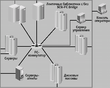 Рис. 2. Архитектура управления Различают два вида SAM: внутриконтурное управление (in-band) и управление по дополнительному (вспомогательному) каналу (out-of-band). При построении внутриконтурной архитектуры функции управления выполняются с использованием существующих каналов системы хранения (обычно Fibre Channel). В случае управления по дополнительному каналу обмен данными между элементами сети хранения и консолью управления осуществляется с использованием протокола SNMP по сети Ethernet. Архитектуры out-of-band и in-band обеспечивают различный уровень надежности, быстродействия, нагрузки на каналы системы хранения и т.д. Для реализации различных специфических функций SAM зачастую одновременно используются оба подхода. Фундаментальные разработки в области управления хранением ведутся сегодня по следующим направлениям: