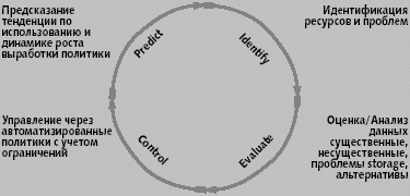Рис. 3. Управление жизненным циклом Последовательное прохождение этих фаз позволяет планировать развитие среды хранения данных. Выявленные тенденции должны быть проанализированы и сопоставлены с планом развития системы для выявления отклонений. Таким образом, осуществляется переход к непрерывному процессу SAM. Различные подходы к управлению хранениемУсловно можно выделить две большие категории решений: специализированные (направленные на решения определенной задачи) и интегрированные (обладающие набором разнообразных функций SAM). Для корпоративных заказчиков наибольший интерес представляет вторая категория, так как данные решения могут рассматриваться как часть единой корпоративной системы управления. Разработчики интегрированных решений стараются максимально охватить функциональность, представленную в Пирамиде управления. Тем не менее, важно понимать, какие из функций управления пользователь получает в свое распоряжение вместе с предлагаемыми продуктами. IBM/Tivoli Policy-based Management
