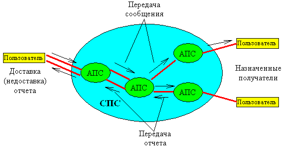 Рис.3. Модель системы передачи сообщений Объекты АПС имеют следующие порты: представления, доставки, административный. Порт доставки позволяет пользователю СПС воспринимать доставку сообщений из СПС и получать отчеты о доставке или недоставке сообщений и зондов. Административный порт позволяет пользователю СПС изменять параметры настройки, относящиеся к доставке сообщения, и позволяет СПС или пользователю СПС обмениваться своими удостоверениями личности. Порт предоставления позволяет пользователю СПС представлять сообщения СПС для их передачи и доставки одному или нескольким получателям СПС и зондировать способность СПС доставлять сообщение. В общем случае сообщение, зонд или отчет могут быть переданы несколько раз между различными АПС, чтобы достигнуть искомого адресата. Если сообщение адресуется нескольким получателям, обслуживаемым несколькими различными АПС, оно должно передаваться через СПС по нескольким различным маршрутам. В таком АПС создается две копии сообщения, каждая из которых передается следующему АПС по соответствующему маршруту. Копирование и передача сообщений по нескольким путям повторяется до тех пор, пока копия не достигнет конечного АПС, откуда сообщение может быть доставлено одному или нескольким пользователям СПС. Каждый расположенный на маршруте принимающий сообщение АПС берет на себя ответственность за его доставку или передачу конкретному набору изначально заданных получателей. Другие АПС берут на себя ответственность за его доставку или передачу остальным получателям, используя созданные на маршруте копии сообщения. Отчеты о доставке или недоставке сообщения одному или нескольким пользователям СПС вырабатываются в АПС в соответствии с запросами отправителя сообщения и АПС отправителя. АПС может сгенерировать отчет о доставке в случае успешной доставки копии сообщения принимающему пользователю СПС. Однако он может сгенерировать отчет о недоставке, если определит, что копию сообщения невозможно доставить одному или нескольким получателям, то есть что он не может доставить сообщение принимающим пользователям СПС или передать сообщение смежному АПС, который смог бы взять на себя ответственность за доставку или дальнейшую передачу сообщения. Для большей эффективности АПС может сгенерировать один составной отчет, относящийся к нескольким копиям одного сообщения для группы пользователей, за которых он несет ответственность. Отчеты о доставке и недоставке могут объединяться в одном составном отчете. Однако при подобном объединении содержимое сообщения должно подвергаться одинаковому для всех получателей преобразованию (конечно, только в тех случаях, если таковое требуется). При необходимости это может выполнить АПС. Если же ни отправляющий, ни принимающий пользователь СПС не запрашивает и не запрещает преобразование, АПС может выполнить неявное преобразование типов кодированной информации, чтобы ее мог воспринять принимающий пользователь СПС. Отправитель может также явно запросить преобразование конкретных типов кодированной информации для конкретных принимающих пользователей СПС. АдресацияАдресация в Х.400 очень проста. В то же время она является одной из самых мощных среди существующих и идентифицируется именами О/П (отправитель / получатель). Адрес О/П соде