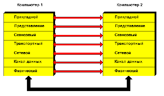 Потоки информации в модели организованы так, что каждый уровень предполагает, будто он напрямую взаимодействует с одноименным уровнем другого узла. Как показано на рисунке, сетевой уровень компьютера 1 предполагает, что он взаимодействует с сетевым уровнем компьютера 2. На самом же деле, каждый уровень может взаимодействовать только с соседними уровнями на своем компьютере. Для "взаимодействия" одноименных уровней модели организуется "сессия" Например, сетевой уровень компьютера 1 организует сессию с сетевым уровнем компьютера 2 следующим способом: