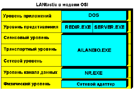 На рисунке показано распределение модулей LANtastic в модели OSI.