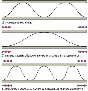 Иногда необходимо использовать кабель, у которого полностью отсутствуют металлические компоненты. Как же в этом случае обеспечить надежную защиту от грызунов? Существуют волоконно-оптические кабели с так называемой "неметаллической броней". Это подразумевает либо внешний слой из особо прочного диэлектрического материала, например, полиамида толщиной полмиллиметра, либо тонкий слой полипропилена. Хорошую защиту от грызунов может обеспечить и плотный слой стекловолоконных нитей (не путать с нитями из кевлара), которые выполняют также роль силовых элементов. Однако при изгибе кабеля трубка с оптическими волокнами может выйти из слоя продольно-натянутых стекловолоконных нитей, что ставит под угрозу защиту волокна. Этого можно избежать, если стекловолоконные нити закручены в спираль или даже переплетены вместе - таким образом степень защиты повышается. Все эти способы защиты от грызунов основываются на тех особенностях конструкции волоконно-оптического кабеля, которые помогают усилить его механическую прочность. Существует и другой способ, который базируется на добавлении специальных химических компонентов во внешнюю оболочку (у нас нечасто можно встретить такой тип кабеля из-за его высокой стоимости). Построение волоконно-оптических каналов связи требует значительных капиталовложений, поэтому, начиная с этапа проектирования, необходимо свести до минимума те факторы, которые могут снизить надежность линии передачи. При этом защита от грызунов является составной частью задачи по обеспечению стабильной работы волоконно-оптического канала связи. Это актуально и при вкапывании кабеля в землю, и при прокладке в канализациях или туннелях метрополитена. Конечно, можно изготовить волоконно-оптический кабель, в котором бы предусматривались все перечисленные виды защиты от грызунов. Однако кабелю необходимо обладать и другими качествами, такими как пожаробезопасность, небольшой вес или отсутствие металлических компонентов. Стоимость здесь также играет не последнюю роль. Поэтому в кабеле чаще реализуются один или два способа, которые бы в большей степени обеспечивали защиту от грызунов. Усиливающие элементыДля увеличения допустимого растяжения волоконно-оптического кабеля в его конструкцию обязательно вводят силовые элементы. Величины допустимого растяжения в 1000-2000 Н (ньютонов) можно достичь с помощью использования кевларовых или стекловолоконных нитей. Как правило, этого показателя бывает вполне достаточно для кабелей общего назначения. Нити могут образовывать плотный слой, а могут и переплетаться. Считается, что кевларовые нити обеспечивают большее допустимое усилие на разрыв. Однако стекловолокон-ные нити еще и защищают от грызунов и являются барьером для распространения горения. Иногда параллельно с кевларовыми нитями применяют один центральный или пару боковых стержней. Дополнительные силовые элементы могут быть диэлектрическими или металлическими. Конструкция с центральным силовым элементом характерна для кабеля с большим числом волокон, которые группами размещаются вокруг силового элемента. Высокое допустимое усилие на разрыв в специальных типах кабелей, в которых эта величина должна иметь значение десятков килоньютонов, достигается с помощью стальных прутьев. В таких кабелях оптические 