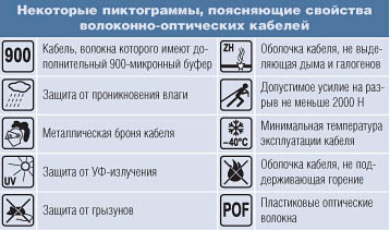 Выбор кабеляВыбрать из всего многообразия предлагаемых на рынке волоконно-оптических кабелей тот, который полностью отвечает поставленной задаче, очень сложно. Во-первых, нужны глубокие познания в этой области, но здесь может помочь квалифицированный дилер или системный интегратор. Во-вторых, сам заказчик порой не может правильно сформулировать исходные данные. В-третьих, исполнителю чаще всего приходится балансировать между техническими характеристиками волоконно-оптического кабеля и его стоимостью. Последнее условие, пожалуй, самое важное. Не секрет, что уменьшение такого параметра, как допустимая нагрузка на разрыв, снижает стоимость кабеля на 20-30%. Используя внешнюю оболочку из полиэтилена вместо LSZH, можно также заметно уменьшить стоимость. Но стоит ли рисковать ради кратковременной выгоды? Экономя сегодня, завтра можно потерять доверие конечного пользователя, который вкладывает немалые средства в построение волоконно-оптической линии передачи и надеется на ее стабильную работу в течение многих лет. Конечно, наш рынок информационных технологий еще не совсем готов к тому, чтобы волоконная оптика была в каждом офисе и в каждом доме. Однако нужно уже сегодня закладывать основы цивилизованных и технически грамотных решений. Так как же защитить инвестиции конечного пользователя? Как ни банально это звучит, необходимо работать только с высококвалифицированным системным интегратором. Графическое обозначение характеристик кабеляЗалогом успешного продвижения продукта является четкое понимание поставщиками его особенностей и умение объяснить это потребителю. Например, оценить характеристики кабеля можно по прилагаемому к продукту техническому описанию. Здесь, возможно, не стоит знать всю методику определения механических параметров согласно стандарту ЕС 60794-1, но разбираться, что какой параметр обозначает, нужно точно. Немецкий стандарт DIN VDE 0888 (о котором мы подробно рассказывали в предыдущем номере) дает довольно полную информацию о волоконно-оптическом кабеле. Однако для этого необходимо выполнение двух условий: маркировка кабеля в соответствии с DIN VDE 0888 и наличие таблицы, поясняющей данную маркировку. Оригинальное решение для указания наиболее важных свойств кабеля предлагает компания R&M. Речь идет об использовании ряда пиктограмм, предоставляющих наглядную информацию о волоконно-оптическом кабеле. Некоторые из таких пиктограмм представлены в таблице ниже.