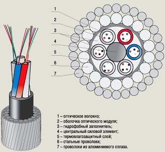 Рисунок 10. Оптический кабель, вмонтированный в канат грозозащиты (OPGW), со свободной укладкой оптических модулей.