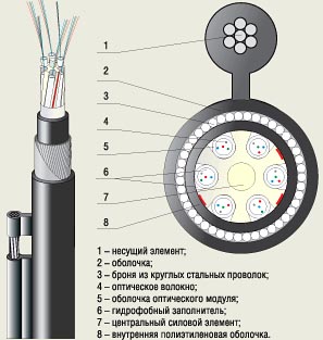 Рисунок 8. Оптический кабель типа "8" со стальным тросом в качестве несущего элемента и бронепокровом из круглых стальных оцинкованных проволок.