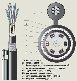 Рисунок 9. Оптический кабель типа "8" ленточной конструкции со стальным тросом в качестве несущего элемента и профилированным сердечником.