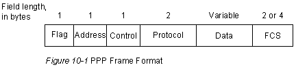 Основные принципы работыДля того, чтобы организовать связь через канал связи с непосредственным соединением, инициирующий РРР сначала отправляет пакеты LCР для выбора конфигурации и (факультативно) проверки канала передачи данных. После того, как канал установлен и пакетом LCР проведенo необходимое согласование факультативных средств, инициирующий РРР отправляет пакеты NCP, чтобы выбрать и определить конфигурацию одного или более протоколов сетевого уровня. Как только конфигурация каждого выбранного протокола определена, дейтаграммы из каждого протокола сетевого уровня могут быть отправлены через данный канал. Канал сохраняет свою конфигурацию для связи до тех пор, пока явно выраженные пакеты LCP или NCP не закроют этот канал, или пока не произойдет какое-нибудь внешнее событие (например, истечет срок бездействия таймера или вмешается какой-нибудь пользователь). Требования, определяемые физическим уровнемРРР может работать через любой интерфейс DTE/DCE (например, EIA RS-232-C, EIA RS-422, EIA RS-423 и CCITT V.35). Единственным абсолютным требованием, которое пред'являет РРР, является требование обеспечения дублированных схем (либо специально назначенных, либо переключаемых), которые могут работать как в синхронном, так и в асинхронном последовательном по битам режиме, прозрачном для блоков данных канального уровня РРР. РРР не пред'являет каких-либо ограничений, касающихся скорости передачи информации, кроме тех, которые определяются конкретным примененным интерфейсом DTE/DCE. Канальный уровень PPPРРР использует принципы, терминологию и структуру блока данных процедур HDLC (ISO 3309-1979) Международной Организации по Стандартизации (ISO), модифицированных стандартом ISO 3309-1984/PDAD1 "Addendum 1:Start/stop Trasmission" (Приложение 1: Стартстопная передача"). ISO 3309-1979 определяет структуру блока данных HLDC для применения в синхронных окружениях. ISO 3309-1984/PDAD1 определяет предложенные для стандарта ISO 3309-1979 модификации, которые позволяют его использование в асинхронных окружениях. Процедуры управления РРР используют дефиниции и кодирование управляющих полей, стандартизированных ISO 4335-1979 и ISO 4335-1979/Addendum 1-1979. Нa Рис. 10-1 приведен формат блока данных РРР.