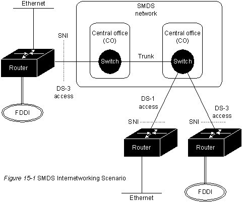 Библиографическая справкаSwitched Multimegabit Data Service (SMDS) (Служба коммутации данных мультимегабитного диапазона) является службой дейтаграмм с коммутацией пакетов, предназначенной для высокоскоростных информационных сообщений глобальных сетей. Обеспечивая пропускную способность , которая первоначально будет находиться в диапазоне от 1 до 34 Mg/сек, SMDS в настоящее время начинает повсеместно использоваться в общедоступных сетях передачи данных коммерческими сетями связи в результате реакции на две тенденции. Первая из них-это пролиферация обработки распределенных данных и других прикладных задач, для реализации которых необходимы высокопроизводительные об'единенные сети. Второй тенденцией является уменьшающаюся стоимость и высокий потенциал полосы пропускания волоконно-оптического носителя, обеспечивающие жизнеспосособность таких прикладных задач при их использовании в глобальных сетях. SMDS описана в серии спецификаций, выпущенных Bell Communications Reseach (Bellcore) и принятых поставщиками оборудования для телекоммуникаций и коммерческими сетями связи. Одна из этих спецификаций описывает SMDS Interface Protocol (SIP) (Протокол интерфейса SMDS), который является протоколом согласования между устройством пользователя (называемым также customer premises equipment - CPE - оборудованием в помещении заказчика) и оборудованием сети SMDS. SIP базируется на стандартном протоколе IEEE для сетей крупных городов (MAN), т.е. на стандарте IEEE 802.6 Distribuited Queue Dual bus (DQDB) (Дублированная шина очередей к распределенной базе данных). При применении этого протокола устройства CPE, такие как роутеры, могут быть подключены к сети SMDS и пользоваться обслуживанием SMDS для высокоскоростных об'единенных сетей. Основы технологииНа рис.15-1 изображен сценарий межсетевого об'единения с использованием SMDS. Как показано на рисунке, доступ к SMDS обеспечивается либо через средства передачи с пропускной способностью 1.544-Mgps (DS-1 или Digital Signal 1), либо через средства передачи с пропускной способностью 44.736-Mgps (DS-3 или Digital Signal 3). Несмотря на то, что SMDS обычно описывается как обслуживание, базирующееся на волоконно-оптических носителях, доступ DS-1 может быть обеспечен либо через волоконно-оптический, либо через базирующийся на меди носитель с достаточно хорошими показателями характеристики погрешностей. Пункт разграничения между сетью SMDS частной компании- владельца сети связи и оборудованием клиента называется интерфейсом абонент/сеть (SNI).