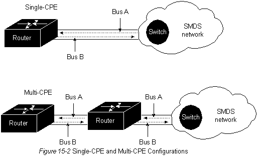 Существуют две возможные конфигурации оборудования СРЕ для получения доступа DQDB к сети SMDS (смотри рис.15-2). При конфигурации с одним СРЕ доступ DQDB просто соединяет переключатель в коммерческой сети и одну станцию, принадлежащую абоненту (СРЕ). Для конфигурации с большим числом СРЕ, доступ DQDB состоит из переключателя в сети и множества об'единенных СРЕ в местоположении абонента. Для второй конфигурации, все СРЕ должны принадлежать одному и тому же абоненту.
