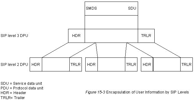 Для случая с одним СРЕ, доступ DQDB фактически представляет собой просто подсеть DQDB из двух узлов. Каждый из этих узлов (переключатель и СРЕ) передают данные другому через однонаправленную логическую шину. Конкуренция на получение этой шины отсутствует, т.к. других станций нет. Поэтому нет необходимости использовать алгоритм распределенного доступа с организацией очереди. При отсутствии той сложности, которую создает применение алгоритма распределенного доступа с организацией очереди, SIP для конфигурации с одним СРЕ намного проще, чем SIP для конфигурации с большим числом СРЕ. SIP может быть логически разделен на 3 уровня, как это показано на Рис. 15-3 "Формирование пакета данных пользователя уровнями SIP".