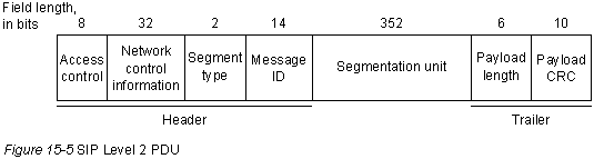 Уровень 3 Задачи, выполняемые уровнем 3 SIP, включают в себя формирование пакета "единиц данных обслуживания SMDS" (service data units (SDU)) в заголовке и концевике уровня 3. Затем "eдиницы данных протокола" (protocol data units (PDU)) разбиваются на PDU уровня 2 таким образом, чтобы соответствовать спецификациям уровня 2. PDU уровня 3 SIP достаточно сложна. Она изображена на Рис. 15-4.