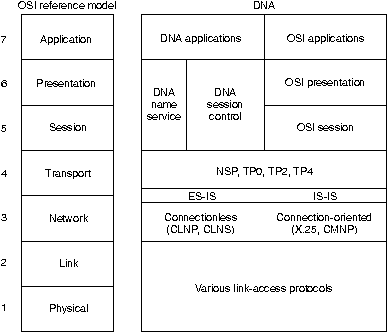 Библиографическая справкаDigital Equipment Corporation (Digital) разработала семейство протоколов DECnet с целью обеспечения своих компьютеров рациональным способом сообщения друг с другом. Выпущенная в 1975 г. первая версия DECnet обеспечивала возможность сообщения двух напрямую подключенных миникомпьютеров PDP-11. В последние годы Digital включила подддержку для непатентованных протоколов, однако DECnet попрежнему остается наиболее важным из сетевых изделий, предлагаемых Digital. В настоящее время выпущена пятая версия основного изделия DECnet ( которую иногда называют Phase V, a в литературе компании Digital - DECnet/OSI). DECnet Phase V представляет собой надлежащим образом расширенный набор комплекта протоколов OSI, поддерживающий все протоколы OSI, а также несколько других патентованных и стандартных протоколов, которые поддерживались предыдущими версиями DECnet. Что касается ранее внесенных изменений в протокол, DECnet Phase V совместим с предыдущей версией (т.е. Phase IV). Архитектура цифровой сети (DNA)В противоположность бытующему мнению, DECnet вовсе не является архитектурой сети, а представляет собой ряд изделий, соответсвующих Архитектуре Цифровой сети ( Digital Network Architecture - DNA) компании Digital. Как и большинство других сложных сетевых архитектур, поставляемых крупными поставщиками систем, DNA поддерживает большой набор как патентованных, так и стандартных протоколов. Перечень технологий, которые поддерживает DNA, постоянно растет по мере того, как Digital реализует новые протоколы. Рис. 17-1 иллюстрирует неполную картину DNA и связь некоторых ее компонентов с эталонной моделью OSI.
