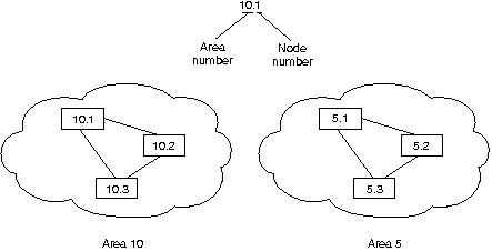 Адреса DECnet не связаны с физическими сетями, к которым подключены узлы. Вместо этого DECnet размещает главные вычислительные машины, используя пары адресов область/узел (area/node address). В диапазон значений адресов области входят значения от 1 до 63 (включительно). Адрес узла может иметь значение от 1 до 1023 (включительно). Следовательно, каждая область может иметь 1023 узла, а в сети DECnet адресация может быть произведена примерно к 65,000 узлам. Области могут перекрывать несколько роутеров, и отдельный кабель может обеспечивать несколько областей. Следовательно, если какой-нибудь узел имеет несколько сетевых интерфейсов, то он использует один и тот же адрес область/узел для каждого интерфейса. На Рис. 17-4 "Адреса DECnet" изображен пример сети DECnet с несколькими адресуемыми об'ектами.