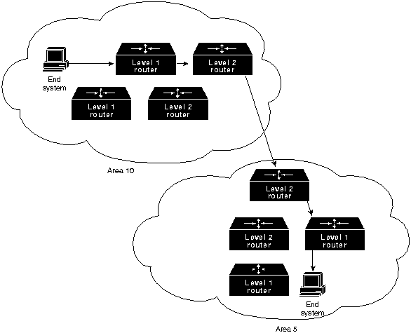 Главные вычислительные машины DECnet не используют адреса уровня МАС (Media Access Control - Управлениe доступом к носителю), назначаемые производителем. Вместо этого адреса сетевого уровня встраиваются в адреса уровня МАС в соответствии с алгоритмом, который перемножает номер области на 1024 и прибавляет к результату номер узла. Результирующий 16-битовый десятичный адрес преобразуется в шестнадцатеричное число и добавляется к адресу АА00.0400 таким образом, что байты оказываются переставленными, так что наименее значимый байт оказывается первым. Например, адрес 12.75 DECnet становится числом 12363 (основание 10), которое равняется числу 304В (основание 16). После этого адрес с переставленными байтами добавляется к ставндартному префиксу адреса МАС DECnet; результирующим адресом является выражение АА00.0400.4В30. Узлы маршрутизации DECnet называются либо роутерами Уровня 1, либо роутерами Уровня 2. Роутер Уровня 1 сообщается с конечными узлами и с другими роутерами Уровня 1 в отдельной конкретной области. Роутеры Уровня 2 сообщаются с роутерами Уровня 1 той же самой области и роутерами Уровня 2 других областей. Таким образом, роутеры Уровня 1 и Уровня 2 вместе формируют иерархическую схему маршрутизации. Рассмотренные взаимоотношения иллюстрируются на Рис. 17-5.