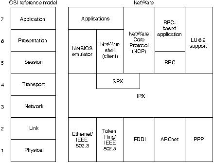 Библиографическая справкаNetWare является операционной системой сети (network operating system - NOS) и связанной с ней средой обеспечения услуг, разработанной Novell, Inc. и представленной на рынок в начале 1980 гг. В то время сети были небольшими и преимущественно гомогенными, связь рабочих групп с помощью локальных сетей была еще новым явлением, а идея о персональном компьютере еще только начала завоевывать популярность. Большая часть технологии организации сетей NetWare была заимствована из Xerox Network Systems (XNS) - системы организации сетей, разработанной Xerox Corporation в конце 1970 гг. Подробная информация о XNS приведена в Главе 22 "XNS". K началу 1990 гг. доля в рынке NOS NetWare возросла до 50-75 % (данные зависят от исследовательских групп, занимавшихся изучением рынка). Установив свыше 500,000 сетей NetWare по всему миру и ускорив продвижение по пути об'единения сетей с другими сетями, NetWare и подддерживающие ее протоколы часто сосуществуют на одном и том же физическом канале с многими другими популярными протоколами, в том числе ТСР/IP, DECnet и AppleTalk. Основы технологииВ качестве среды NOS, NetWare определяет пять высших уровней эталонной модели OSI. Она обеспечивает совместное пользование файлами и принтером, поддержку различных прикладных задач, таких как передача электронной почты и доступ к базе данных, и другие услуги. Также, как и другие NOS, такие как Network File System (NFS) компании Sun Microsystems, Inc. и LAN Manager компании Microsoft Corporation, NetWare базируется на архитектуре клиент-сервер (slient-server architecture). В таких архитектурах клиенты (иногда называемые рабочими станциями) запрашивают у серверов определенные услуги, такие как доступ к файлам и принтеру. Первоначально клиентами NetWare были небольшие РС, в то время как серверами были ненамного более мощные РС. После того, как NetWare стала более популярной, она была перенесена на другие компьютерные платформы. В настоящее время клиенты и сервера могут быть представлены практически любым видом компьютерной системы, от РС до универсальных вычислительных машин. Основная характеристика системы клиент-сервер заключается в том, что доступ к отдаленной сети является прозрачным для пользователя. Это достигается с помощью удаленного вызовова процедур (remote procedure calls) - такого процесса, когда программа местного компьютера, работающая на оборудовании клиента, отправляет вызов в удаленный сервер. Этот сервер выполняет указанную процедуру и возвращает запрошенную информацию клиенту местного компьютера. Рис. 19-1 иллюстрирует в упрощенном виде известные протоколы NetWare и их связь с эталонной моделью OSI. При наличии соответствующих драйверов, NetWare может работать с любым протоколом доступа к носителю. На рисунке перечислены те протоколы доступа к носителю, которые в настоящее время обеспечиваются драйверами NetWare.