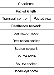 Пакет IPX начинается с 16-битового поля контрольной суммы (checksum), которое устанавливается на единицы. 16-битовое поле длины (length) определяет длину полной дейтаграммы IPX в байтах. Пакеты IPX могут быть любой длины, вплоть до размеров максимальной единицы передачи носителя (MTU). Фрагментация пакетов не применяется. За полем длины идет 8-битовое поле управления транспортировкой (transport control), которое обозначает число роутеров, через которые прошел пакет. Когда значение этого поля доходит до 15, пакет отвергается исходя из предположения, что могла иметь место маршрутная петля. 8-битовое поле типа пакета (packet type) определяет протокол высшего уровня для приема информации пакета. Двумя общими значениями этого поля являются 5, которое определяет Sequenced Packet Exchange (SPX) (Упорядоченный обмен пакетами) и 17, которое определяет NetWare Core Protocol (NCP) (Основной протокол NetWare). Информация адреса пункта назначения (destination address) занимает следующие три поля. Эти поля определяют сеть, главную вычислительную машину и гнездо (процесс) пункта назначения. Следом идут три поля адреса источника (source address), определяющих сеть, главную вычислительную машину и гнездо источника. За полями пункта назначения и источника следует поле данных (data). Оно содержит информацию для процессов высших уровней.
