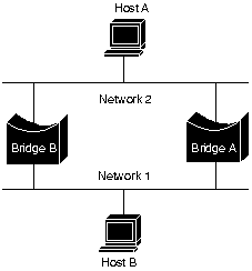 Figure 29-1 Мост использует свою таблицу в качестве базиса для продвижения трафика. Когда на один из интерфейсов моста принят блок данных, мост ищет адрес пункта назначения этого блока данных в своей внутренней таблице. Если таблица содержит взаимосвязь между адресом пункта назначения и любым из портов этого моста, за исключением того, в которой был принят этот блок данных, то блок данных продвигается из указанного порта. Если не найдено никакой взаимосвязи, то блок данных отправляется лавинной адресацией во все порты, кроме порта вхождения блока данных. Широковещательные сообщения и сообщения многопунктовой адресации также отправляются лавинной адресацией таким же образом. ТВ успешно изолирует внутрисегментный трафик, тем самым сокращая трафик, видимый в каждом отдельном сегменте. Это обычно улучшает время реакции сети, видимое пользователю. Степень сокращения трафика и улучшения времени реакции зависят от об'ема межсегментного трафика относительно общего трафика, а также от об'ема широковещательного и многопунктового трафика. Петли в сетях, объединенных с помощью мостовБез протокола взаимодействия между мостами алгоритм ТВ отказывает, когда между двумя любыми LAN об'единенной сети имеется несколько трактов, включающих в себя мосты и локальные сети. Образование петли при об'единении с помощью мостов показано на Рис. 29-2 "Неправильное продвижение пакетов и узнавание информации в средах прозрачного об'единения".