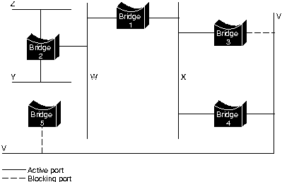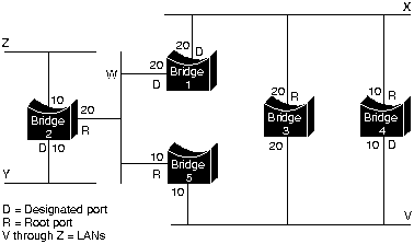 Первым шагом при вычислении связующего дерева является выбор корневого моста (root bridge), который представляет собой мост с наименьшим значением идентификатора моста. На Рис. 29-3 корневым мостом является Мост 1. Далее определяется корневой порт (root port) во всех остальных мостах. Корневой порт моста - это порт, через который можно попасть в корневой мост с наименьшими комбинированными затратами тракта. Эта величина (т.е. наименьшие комбинированные затраты тракта до корневого моста) называется затратами корневого тракта (root path cost). И наконец, определяются назначенные мосты (designated bridges) и их назначенные порты (designated ports). Назначенный мост - это тот мост каждой локальной сети, который обеспечивает минимальные затраты корневого тракта. Назначенный мост локальной сети является единственным мостом, который позволяет продвигать блоки данных в ту локальную сеть (и из нее), для которой этот мост является назначенным. Назначенный порт локальной сети - это тот порт, который соединяет ее с назначенным мостом. В некоторых случаях два или более мостов могут иметь одинаковые затраты корневого тракта. Например, на Рис. 29-3 как Мост 4, так и Мост 5 могут достичь Мост 1 (корневой мост) с затратами тракта 10. В этом случае снова используются идентификаторы моста, на этот раз для определения назначеных мостов. При выборе предпочтение отдано порту LAN V Моста 4 перед портом LAN V Моста 5. При использовании этого процесса устраняются все мосты, непосредственно соединенные с каждой LAN, кроме одного; таким образом, удаляются все петли между двумя LAN. STA также устраняет петли, включающие более двух LAN, в то же время сохраняя связность. На Рис. 29-4 "Сеть ТВ после прогона STA" показаны результаты действия STA в сети, изображенной на Рис. 29-3. На Рис. 29-4 более четко показана топология дерева. Сравнение этого рисунка с рисунком сети до прогона STA показывает, что STA перевел в режим резерва как порты Моста 3 в LAN V, так и порты Moста 5 в LAN V.