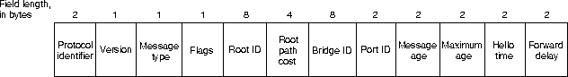 Первым полем сообщения конфигурации ТВ является поле идентификатора протокола (protocol identifier), которое содержит нулевое значение. Вторым полем в сообщении конфигурации ТВ является поле версии (version), которое содержит нулевое значение. Третьим полем в сообщении ТВ является поле типа сообщения (message type), которое содержит нулевое значение. Четвертым полем в сообщении конфигурации ТВ является однобайтовое поле флагов (flags). Бит ТС сигнализирует об изменении в топологии. Бит ТСА устанавливается для подтверждения приема сообщения конфигурации с установленным битом ТС. Другие шесть битов этого байта не используются. Следующим полем в сообщении конфигурации ТВ является поле идентификатора корневого моста (root ID). Это 8-байтовое поле идентифицирует корневой мост путем перечисления его 2-байтового приоритета, за которым следует его 6-байтовый ID. За полем ID корневого моста идет поле затрат корневого тракта (root path cost), которое содержит затраты тракта от моста, который отправляет конфигурационное сообщение, до корневого моста. Далее идет поле идентификатора моста (bridge ID), которое идентифицирует приоритет и ID моста, отправляющего сообщение. Поле идентификатора порта (port ID) идентифицирует порт, из которого отправлено конфигурационное сообщшение. Это поле позволяет обнаруживать и устранять петли, образованные несколькими подключенными мостами. Поле возраста сообщения (message age) определяет промежуток времени, прошедшего с момента отправки корневым мостом конфигурационного сообщения, на котором базируется текущее конфигурационное сообщение. Поле максимального возраста (maximum age) указывает, когда текущее конфигурационное сообщение должно быть стерто. Поле времени приветствия (hello time) обеспечивает период времени между конфигурационными сообщениями корневого моста. И наконец, поле задержки продвижения (forward delay) обеспечивает промежуток времени, в течение которого мосты должны выжидать, прежде чем перейти в новое состояние после изменения в топологии. Если переходы какого-нибудь моста происходят слишком быстро, то не все каналы сети могут оказаться готовыми для изменения их состояний, в результате чего могут появиться петли. Сообщения о топологических изменениях состоят всего из 4 байтов. Они включают в себя поле идентификатора протокола (protocol identifier), которое содержит нулевое значение, поле версии (version), которое содержит нулевое значение и поле типа сообщения (message type), которое содержит значение 128.