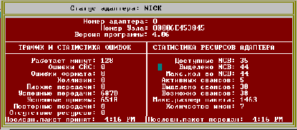 Рис. 21 - 2 В верхней части окна выведено имя компьютера в сети, номер адаптера в нем, идентификатор адаптера и номер версии NetBIOS. Левая панель окна содержит информацию о сетевом трафике и ошибках в процессе работы, в правой приведена информация о ресурсах адаптера. Трафик и статистика ошибок Содержимое этой панели помогает разобраться с аппаратными ошибками в работе адаптера.