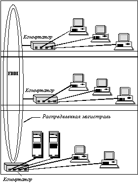 ![]() Рис. 6.3. Структура сети с распределенной магистралью Распределенная магистраль упрощает связи между этажами, сокращает стоимость кабельной системы и преодолевает ограничения на расстояния. Однако, скорость магистрали в этом случае будет существенно меньше скорости магистрали на внутренней шине коммутатора. Причем скорость эта фиксированная и не превышает в настоящее время 100 Мб/c. Поэтому распределенная магистраль может применяться только при невысокой интенсивности трафика между этажами или зданиями. Пример рисунка 6.3 демонстрирует сочетание использования двух базовых структур, так как на каждом этаже сеть построена с использованием магистрали на внутренней шине коммутатора.