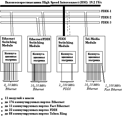 Структура коммутатора до сих пор выдает ориентацию его ранних версий на коммутацию FDDI/Ethernet. До появления модулей, выходящих на высокоскоростную протокольно-независимую шину HSI, коммутатор использовал шины FDDI для межмодульного обмена.